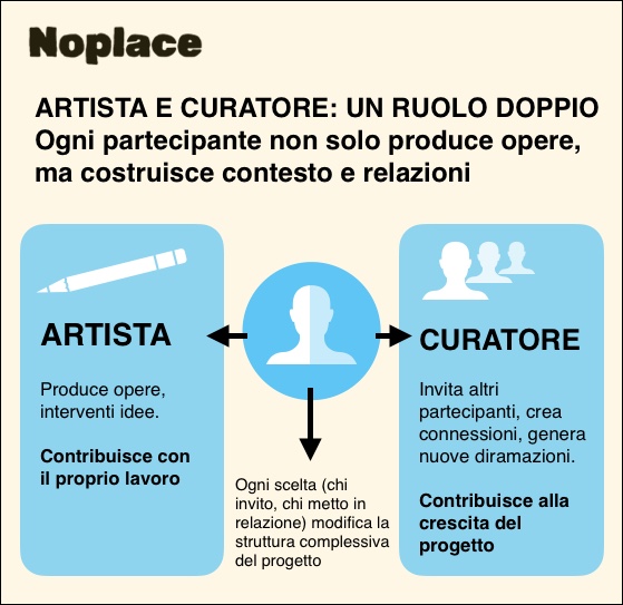 NoPlace rompe questo modello della mostra tradizionale attraverso una struttura rizomatica: non esiste un centro unico, ma una proliferazione di punti attivi. Ogni partecipante è contemporaneamente artista e curatore, e ha la responsabilità di invitare altri partecipanti, generando così nuove diramazioni del progetto.