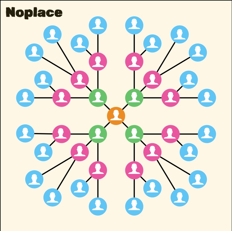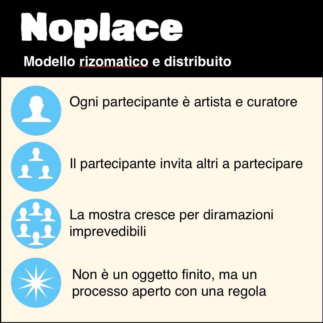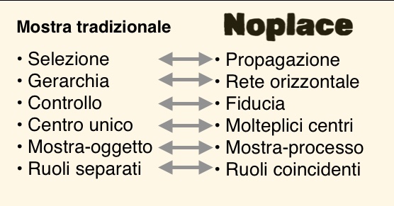 Dove un soggetto (il curatore o promotore) si assume il compito di scegliere a priori uno o più artisti, di individuare un tema e di creare, così, un organismo fatto e finito, pronto ad essere esibito, con una discreta sicurezza sul risultato, al pubblico. Quando, però, si esce dalle piste tracciate e ci si spinge sul terreno delle sperimentazioni culturali, i risultati possono essere sorprendenti: è l'esperienza di NoPlace.Space, una mostra-incontro, un evento sociale più che espositivo che capovolge le consuete modalità organizzative. L'obiettivo non è la sintesi, ma l'espansione: basandosi sulla metafora del rizoma, ogni partecipante è al tempo stesso artista e curatore e, pertanto, chiamato a sua volta a coinvolgere e coordinare altri partecipanti a propria discrezione, attivando relazioni (e connessioni) a catena che sfuggono alla presunzione del controllo centrale.